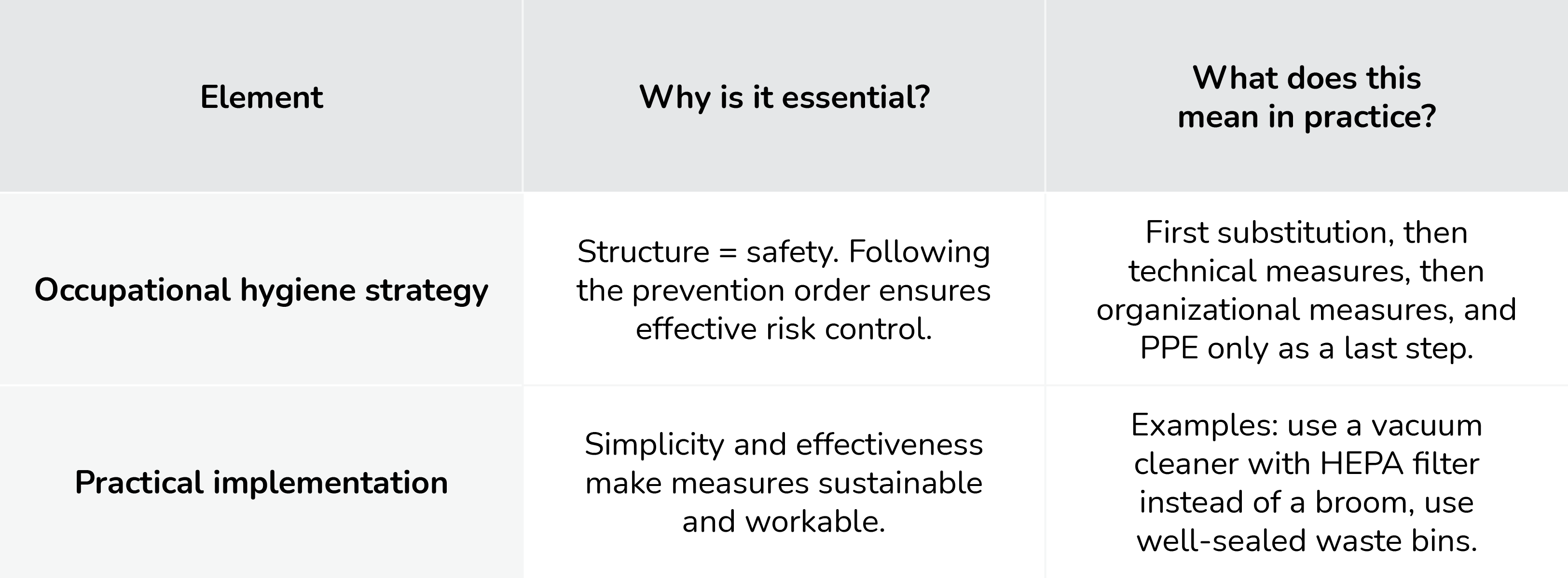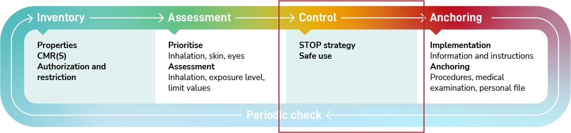 To decide which measures should be taken, the Labour Inspectorate uses the occupational hygiene strategy. This is a fixed order of measures, also known as the STOP strategy: