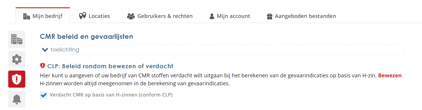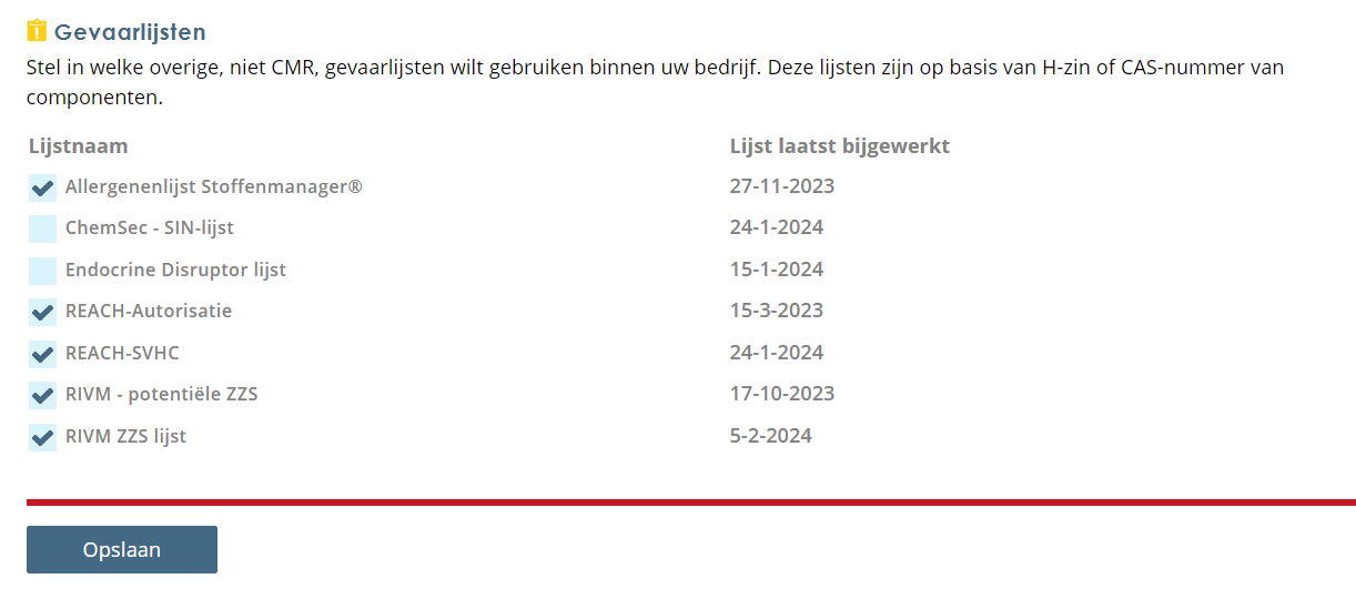 Scroll naar beneden en ga naar “Gevaarlijsten”. Zet een vinkje bij "Allergenenlijst Stoffenmanager®" en Klik op “Opslaan”.