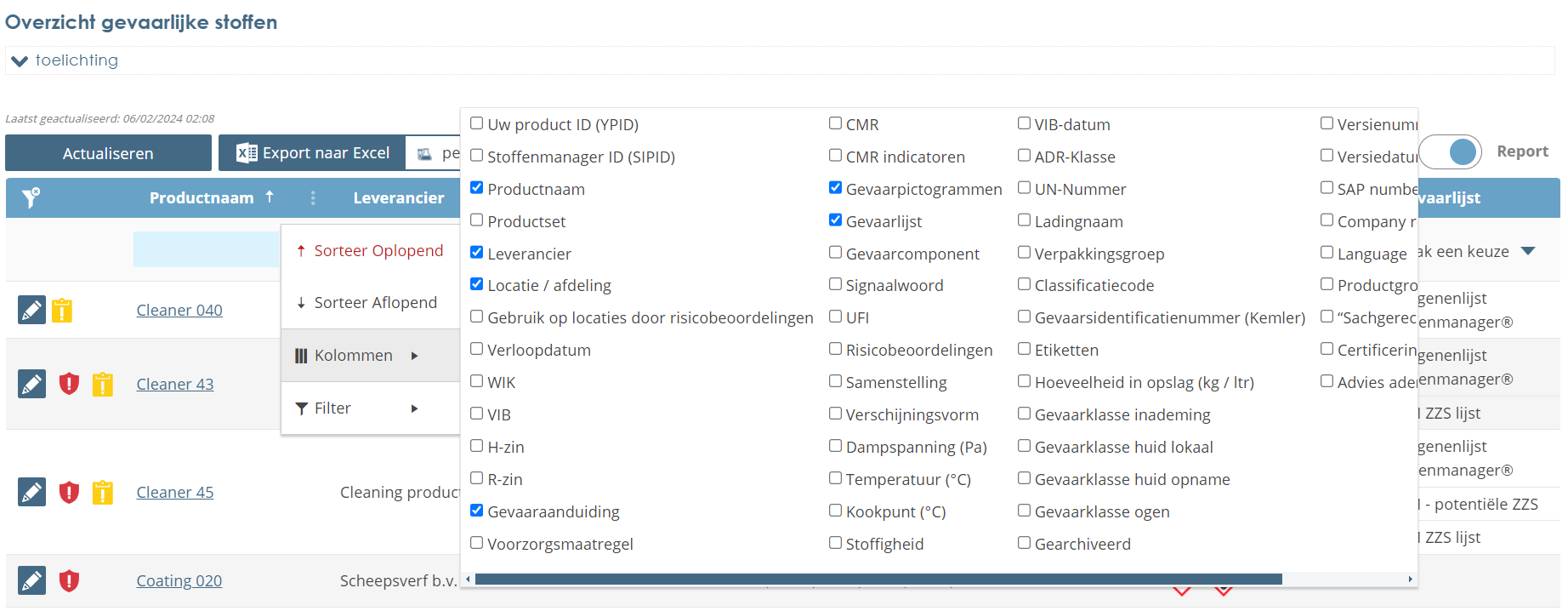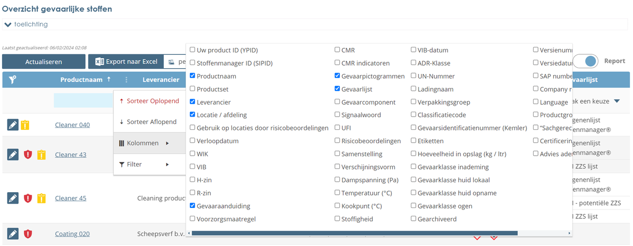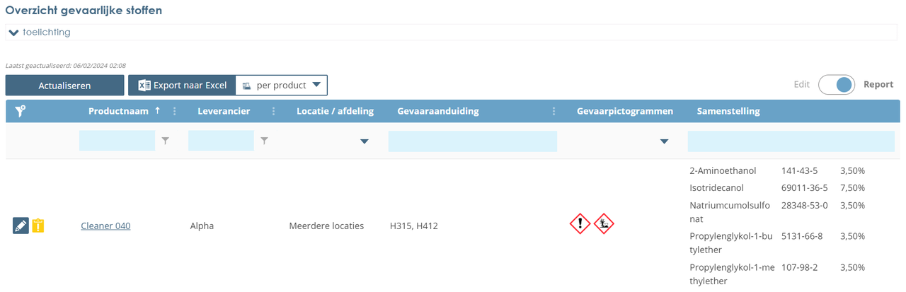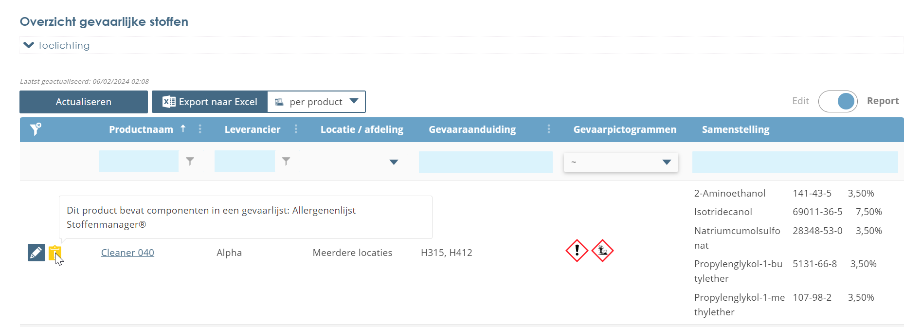 Door het gele klembordje aan de linkerkant ziet u of één of meerdere componenten op een gevaarlijst staan. Als u op het klembordje gaat staan, ziet u op welke lijst één of meer componenten voorkomen.