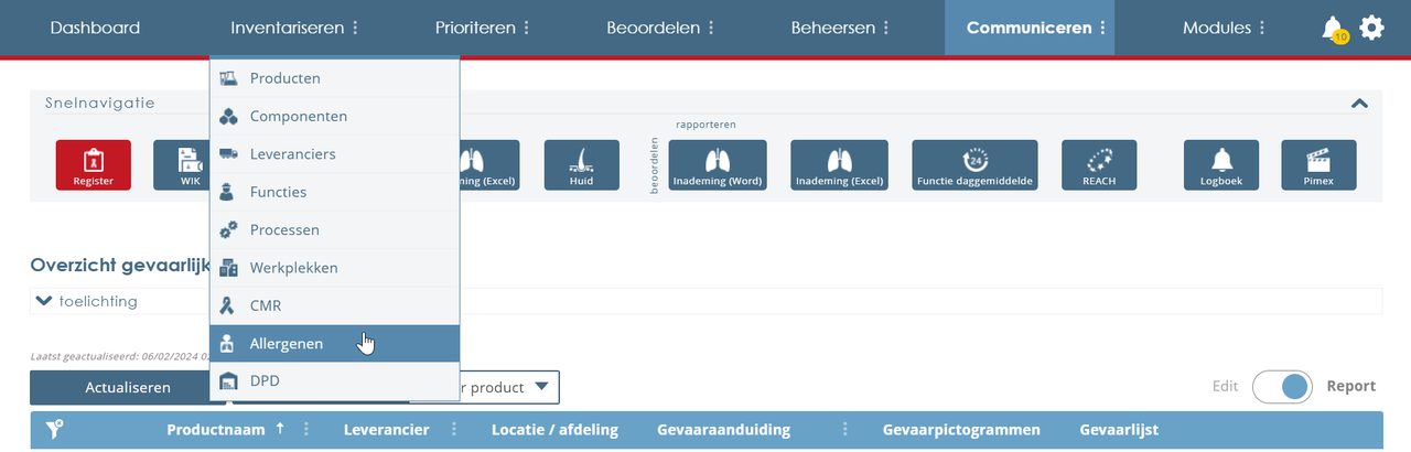 Om te zien welke allergenen binnen uw bedrijf zijn, gaat u naar uw "Productenoverzicht". Ga vervolgens met de toggle-knop naar het "Report-overzicht".